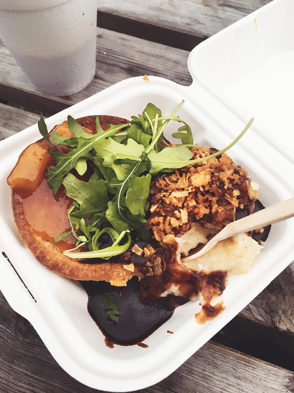 Internet głosi że „mash and pie” to klasyczne danie londyńskiej klasy pracującej, ale na moim instagramie Young Vegans napisali że to comfort food. Jakkolwiek by nie było naprawdę, chciałam w końcu spróbować typowej angielskiej kuchni w wegańskiej odsłonie i to też uczyniłam. Wrażenia mam mieszane, z jednej strony poszczególne składniki spoko – bardzo smaczny chutney – z drugiej strony, jako całość jakoś to ze sobą nie grało. Ale kto wie, może Tobie przypadnie do gustu taki fast food. Duży plus za pomysł, aby weganizować dobrze znane i lubiane potrawy, trafiając z nimi do osób nie będących na diecie wegańskiej. A kolejny za mega miłą obsługę :)