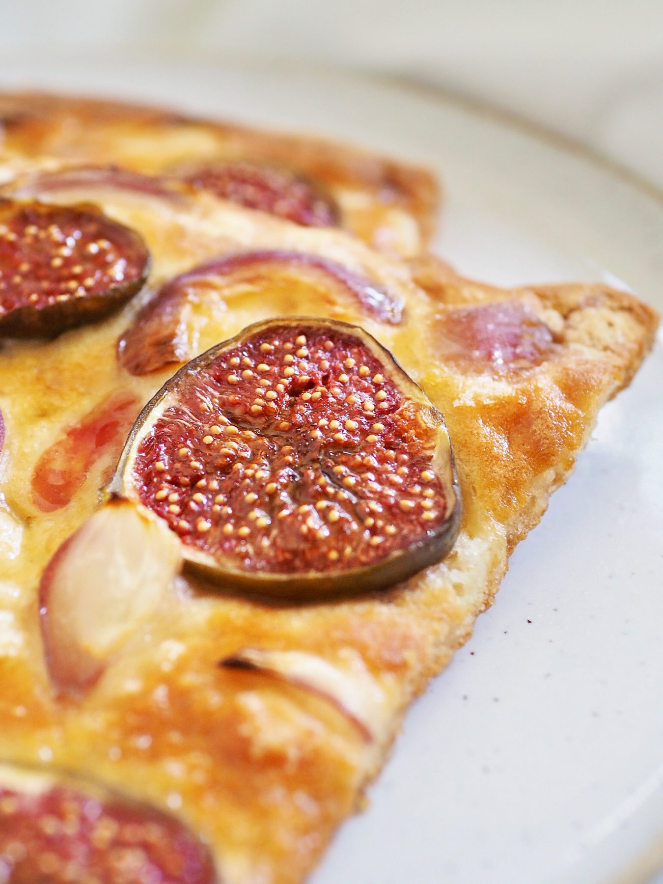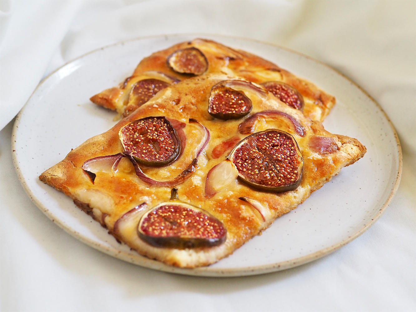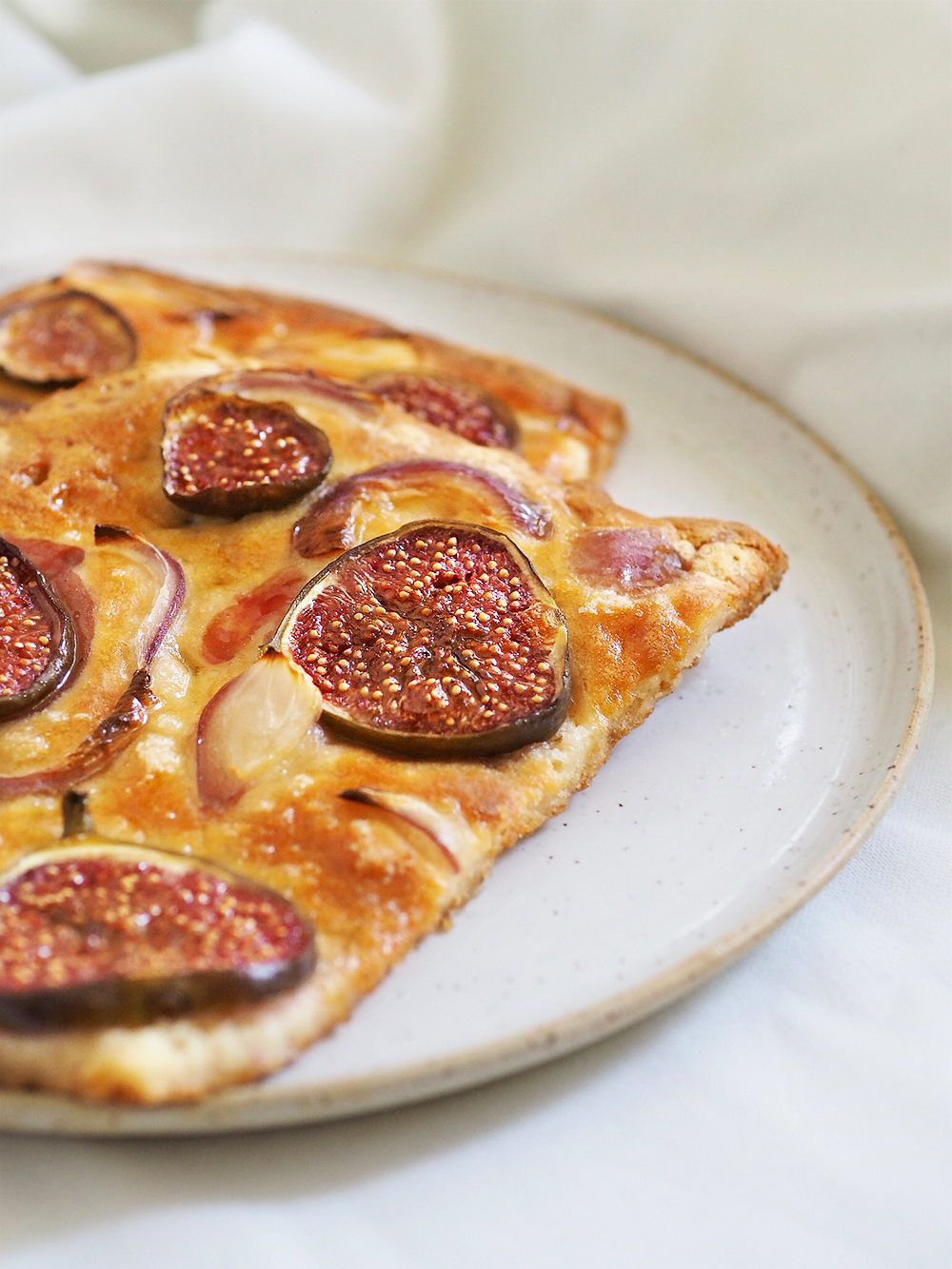 - Ciasto przenieś na blachę wyłożoną papierem do pieczenia, za pomocą mokrych rąk uformuj jak najbardziej płaski placek, udekoruj dodatkami (w moim przypadku plastrami figi i piórami czerwonej cebuli). Opcjonalnie możesz ją teraz zostawić na kolejne 10-15 minut do wyrośnięcia, o ile dasz radę znowu czekać ;) Możesz również skropić oliwą przed wstawieniem do piekarnika.