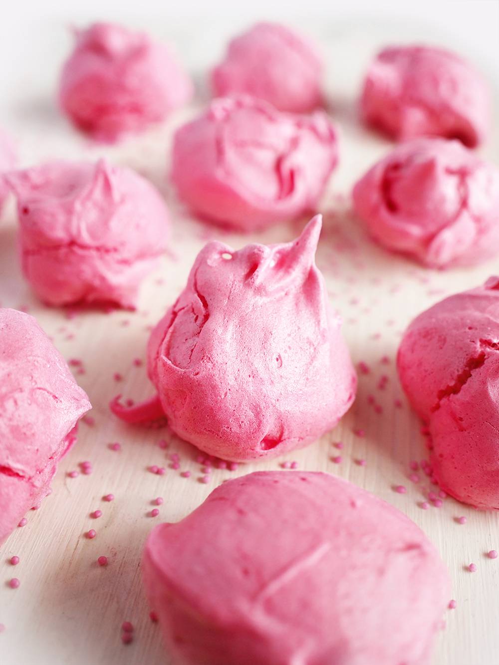 W efekcie powstało kilkadziesiąt leciutkich, puszystych, okropnie słodkich, odblaskowo różowych bez. Kolor możesz zmodyfikować poprzez dodanie np. soku z buraka lub granatu (róż, czerwień), soku ze szpinaku (zieleń), szafranu lub kurkumy (żółty), soku z jagód (niebieski, fiolet) etc.
