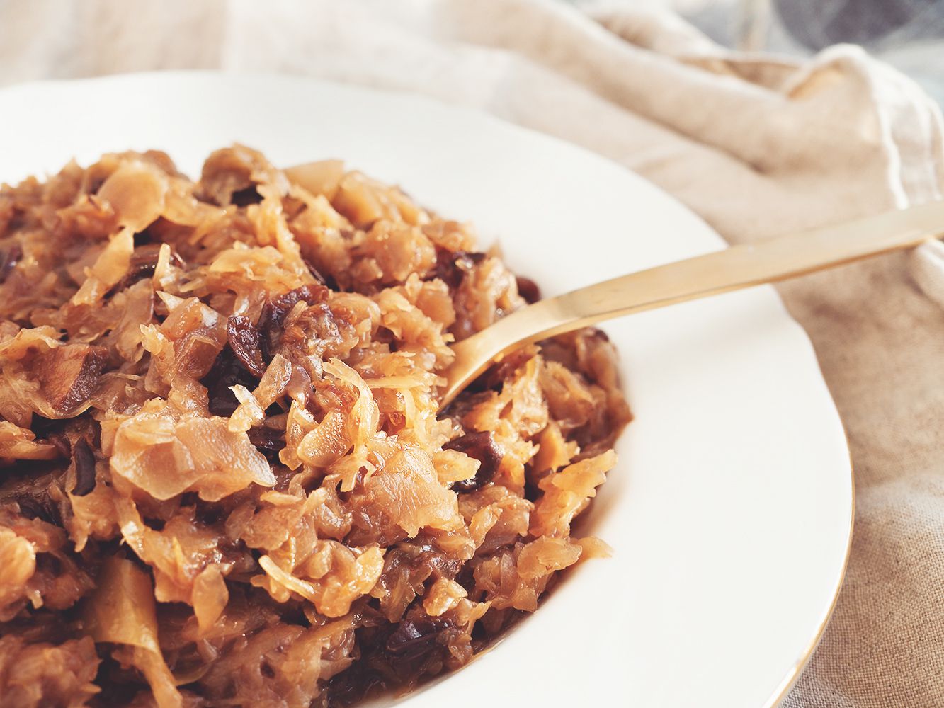 - Gdy kapusta będzie już miękka dodaj namoczone i drobno posiekane grzyby wraz z wodą, podsmażoną cebulę, suszone śliwki, rozkruszone w moździerzu ziarna jałowca oraz wino. Gotuj kolejne 30-60 minut, pilnuj i mieszaj żeby się nie przypaliło.