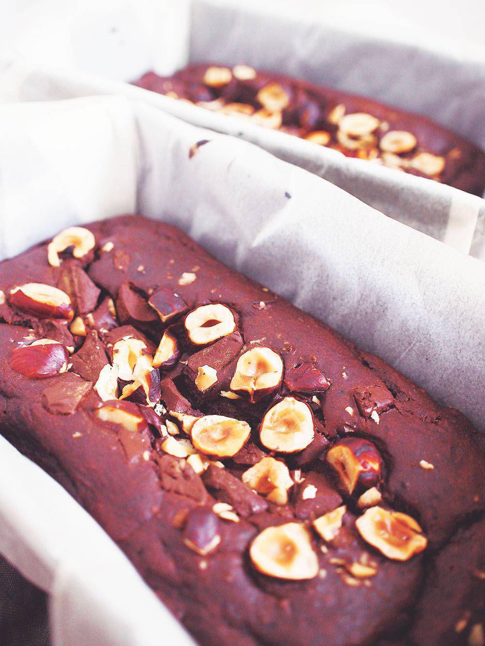 7. Na koniec pokrój orzechy laskowe i tabliczkę gorzkiej czekolady. Część dodaj do ciasta i wymieszaj łyżką, a drugą częścią udekoruj wierzch ciasta jak już umieścisz je w formie do keksa/chleba wyłożonej papierem do pieczenia.