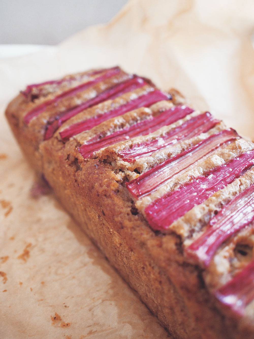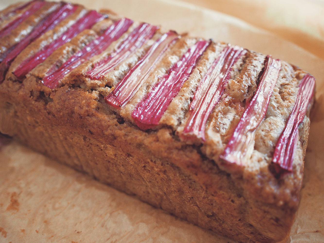 - Gotowe ciasto umieść w blaszce do chleba wyłożonej papierem do pieczenia. Wierz udekoruj podłużnymi kawałkami rabarbaru.