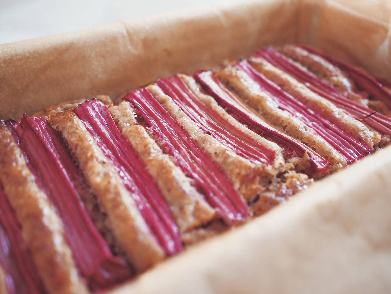 - Place butter in a cake tin lined with baking paper. Decorate with rhubarb.