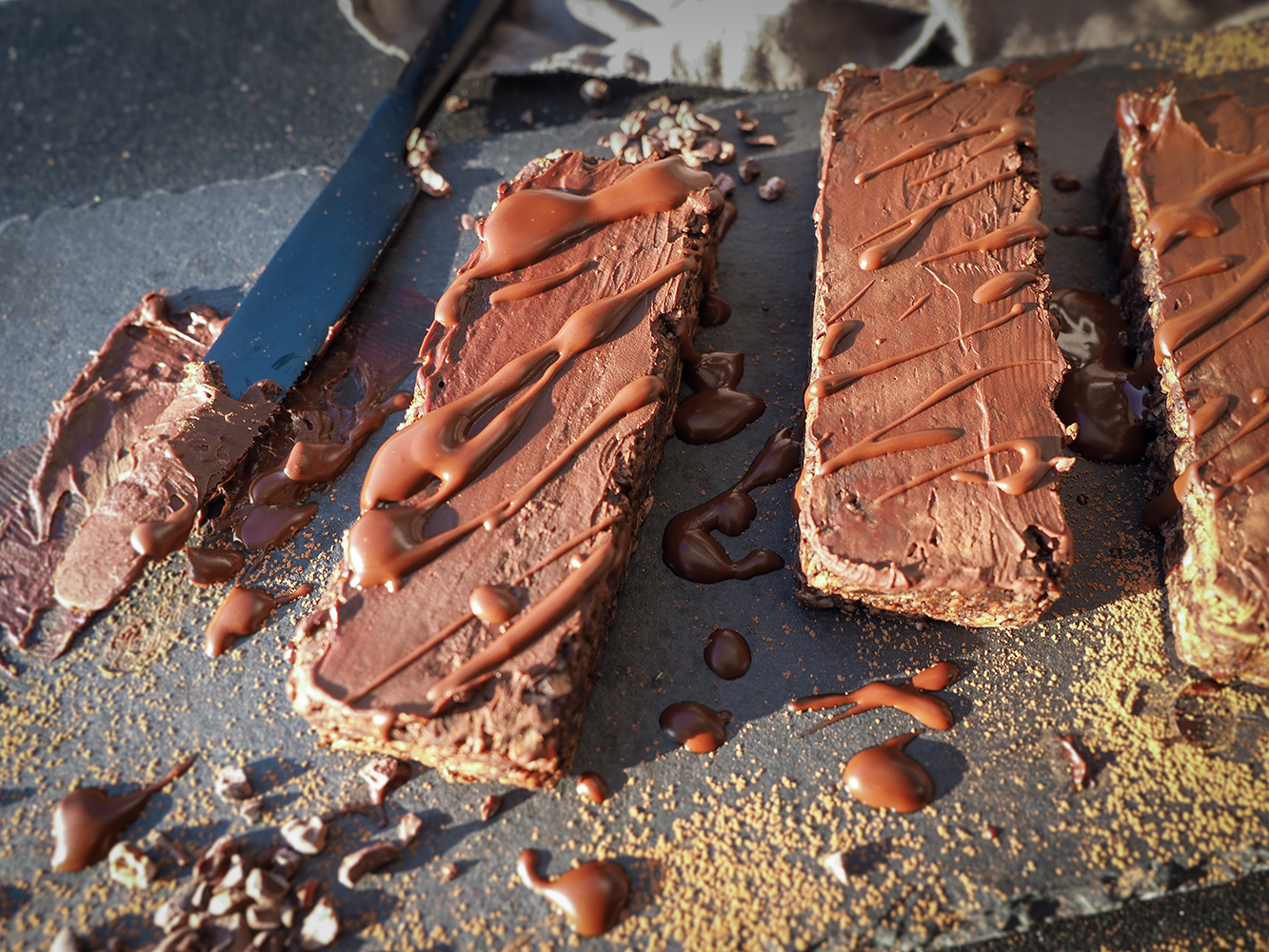 - Jeśli kulki / batony planujesz pokryć czekoladą, rozpuść ją w kąpieli wodnej z odrobiną roślinnego mleka, tak by uzyskała konsystencję pozwalającą na rozprowadzanie jej. Batony łatwo pomalować z wierzchu, a kulki można nabijać na patyczek i zanurzać w czekoladzie, odkładać na papierze do pieczenia, pozostawić do momentu ostygnięcia i stwardnienia czekolady.