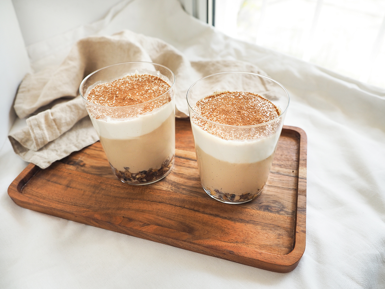 - Teraz do szklanek w których umieściłaś/łeś wcześniej pokrojone orzechy, wlej po równo masę kawową, a następnie łyżką delikatnie umieść (odłożoną wcześniej) masę waniliową. Wierzch udekoruj gorzkim kakao.