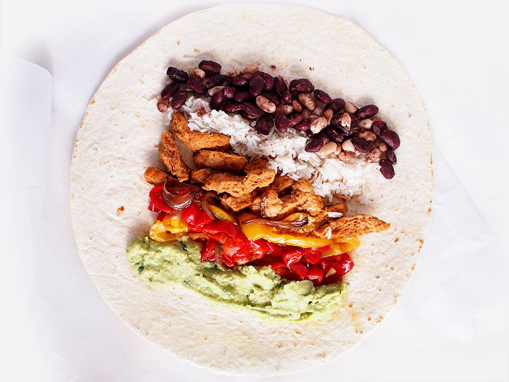 Na koniec przygotuj sobie, lekko podgrzane w piekarniku, tortille (podgrzanie uelastycznia) i wypełnij je przygotowanymi składnikami w dowolnych ilościach i konfiguracji :) Najlepiej dać po trochu: guacamole, sałaty, salsy, ryżu, kotletów sojowych, pieczonej papryki, świeżej kolendry i marynowanych jalapeño. Zawiń tortille, składając najpierw dwa boki do środka, aby uniemożliwić wypadanie nadzienia (podobnie jak to się robi z naleśnikami).