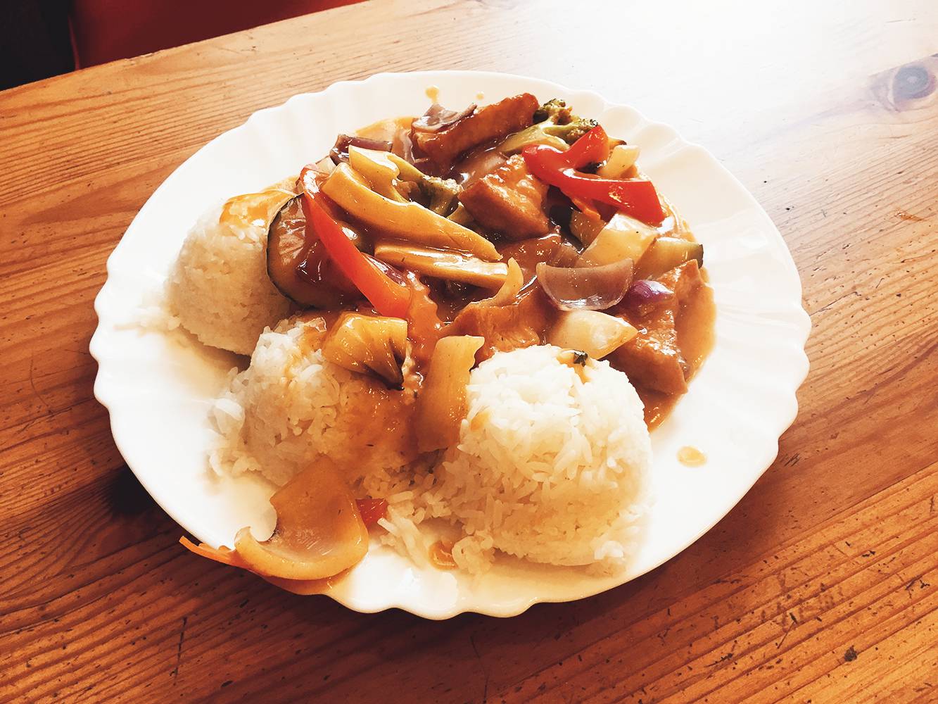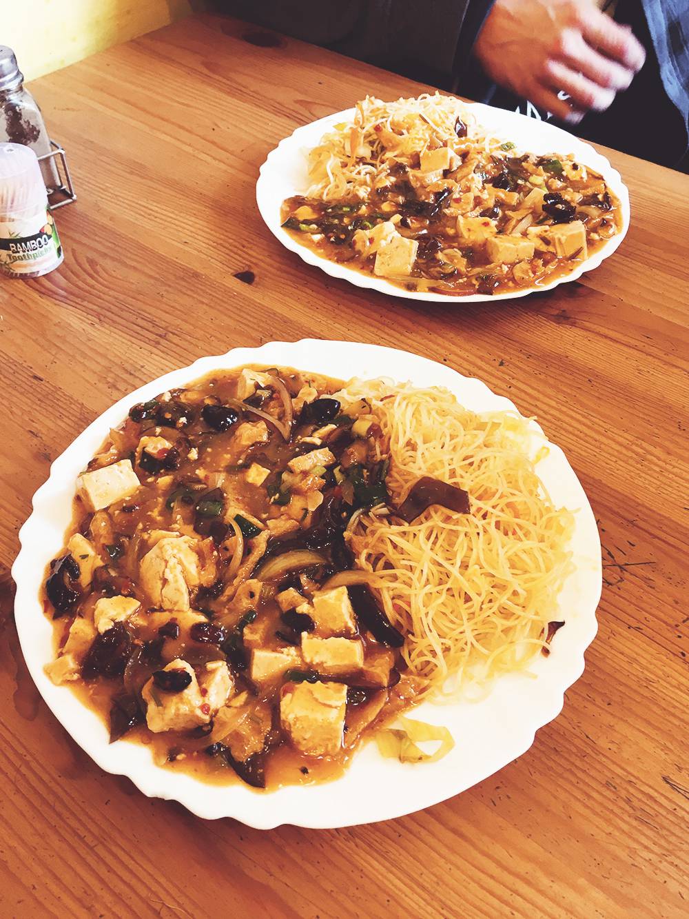 W menu przeważają dania z tofu, ale są także opcje z sojowymi substytutami mięsa. Do konkretnego dania z menu wybierasz sobie dodatek w postaci ryżu, makaronu lub frytek. Dostajesz je chwilę później na stół (porównałabym to z siecią wegańskich barów Loving Hut, tylko bez tej całej sekciarskiej otoczki).