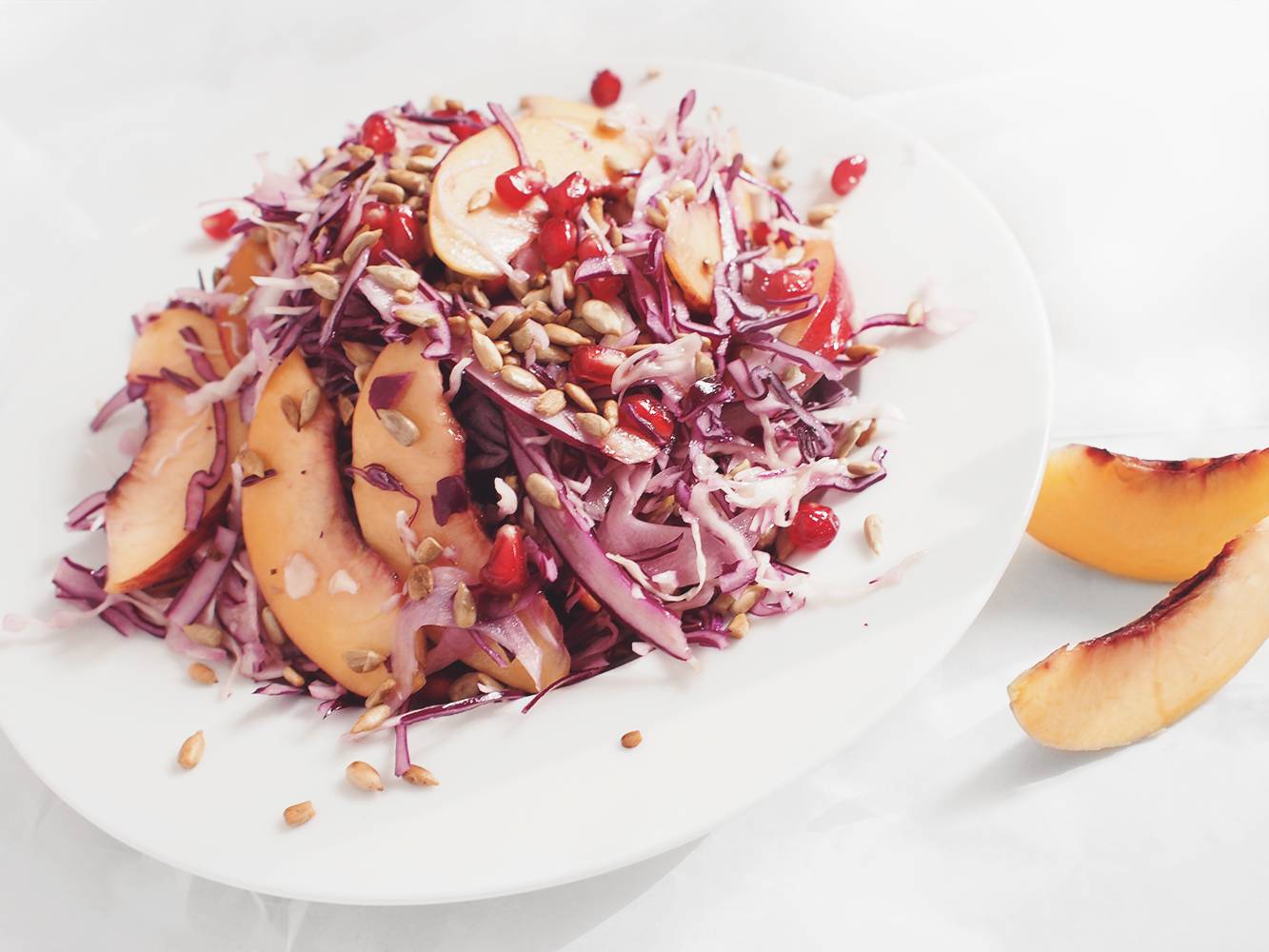 - Put sliced nectarines (or other fruits), pomegranate seeds and roasted sunflower seeds to a bowl with cabbage and mix it well.