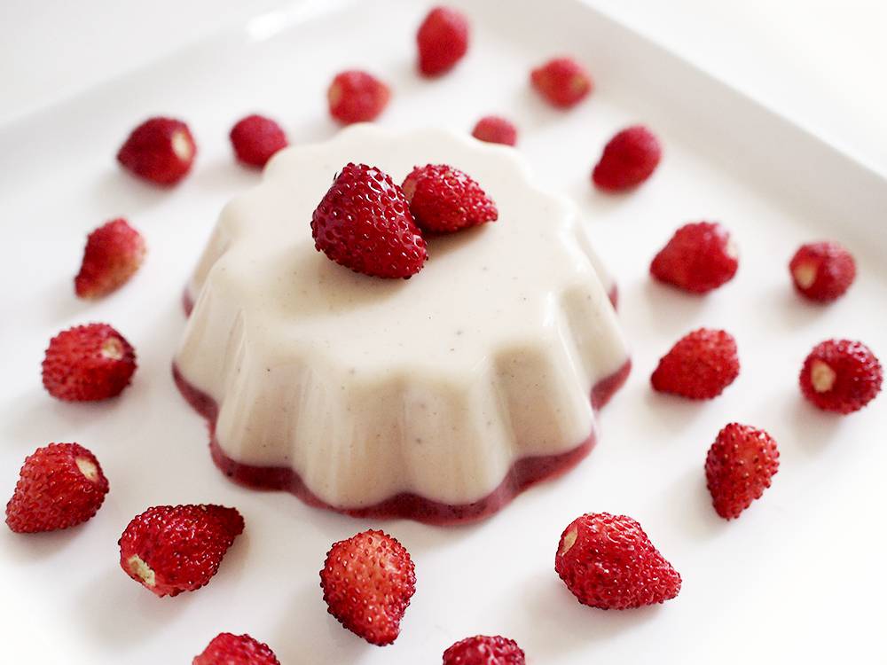 Owoce poziomki idealnie przełamują smak kokosa i wanilii. Deser ten to wariacja na temat pana cotty, tradycyjnego włoskiego przysmaku na bazie śmietany, wanilii i żelatyny. W wersji wegańskiej moim zdaniem niczego mu nie brakuje, nabiera nowego wymiaru i smaku. Dodatkowo jest mega prosty i szybki do przygotowania, a dzięki agarowi tężeje o wiele szybciej niż wersja nie wegańska.