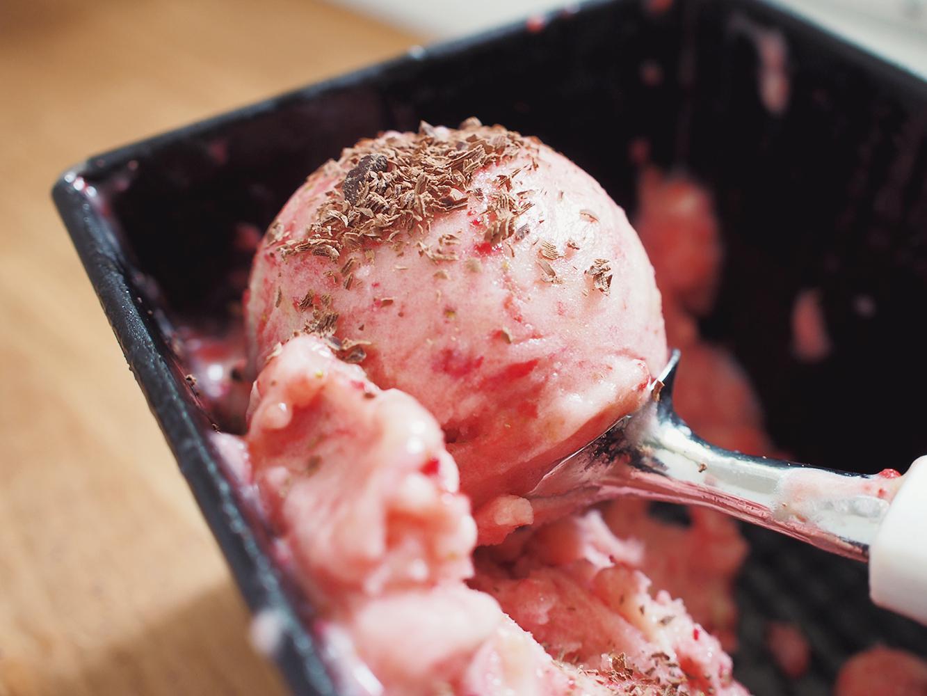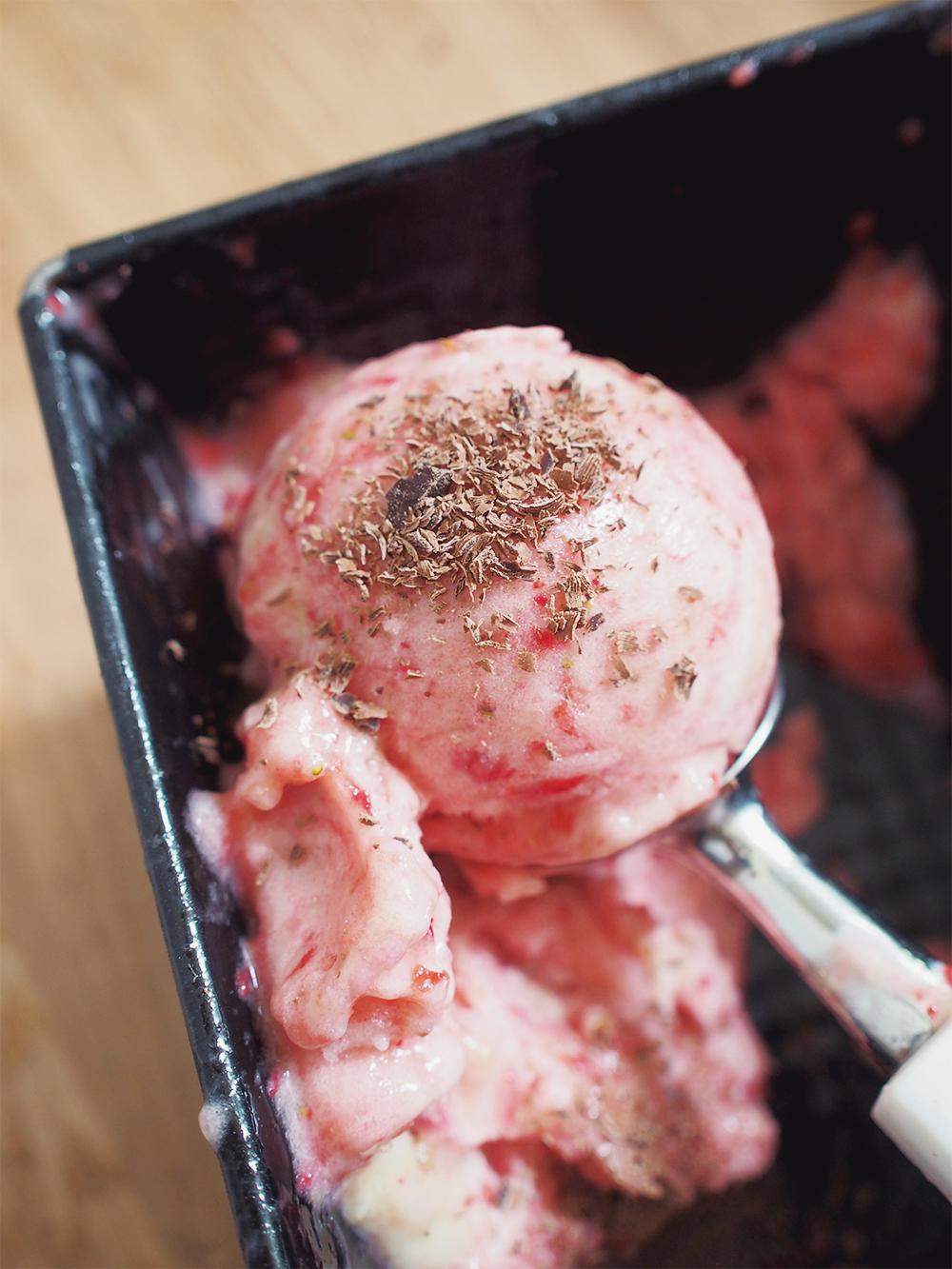 Strawberry banana soft serve with dark chocolate