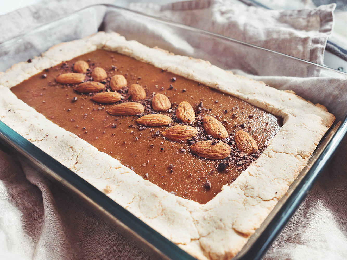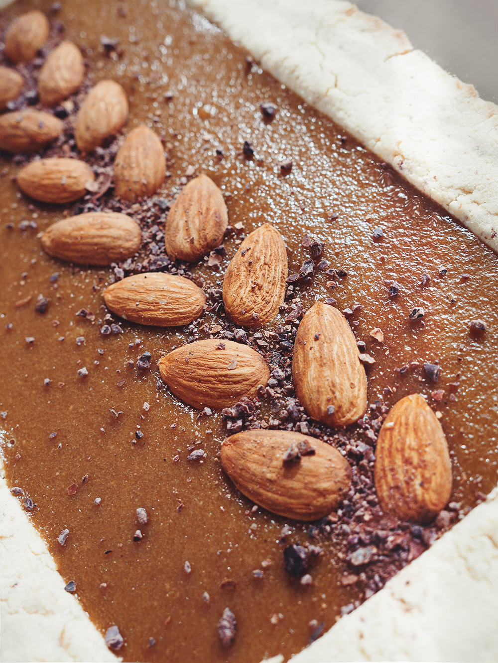 - Now fill the crust with this caramel and decorate with almonds.