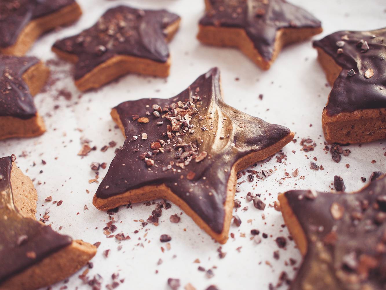 Pierniki dekoruję roztopioną gorzką czekoladą z odrobiną mleka ryżowego lub lukrem z cukru pudru i soku z pomarańczy, lubię minimalizm. Ale ponieważ nie tyczy się to ilości, zrobiłam podwójną porcję i Tobie radzę to samo. Na potrzebę zdjęć posypałam pierniki dodatkowo pokruszonymi nasionami kakaowca i spryskałam złotym spożywczym sprayem ;)