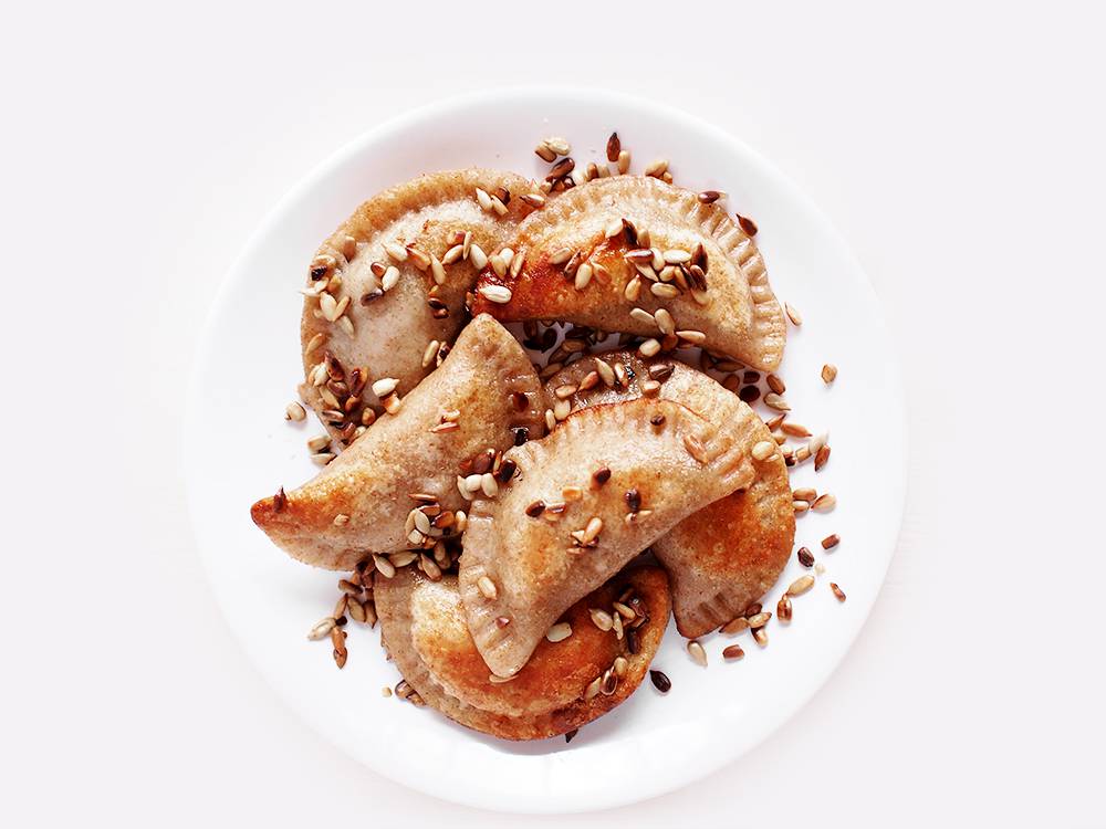 4. Pierogi gotuj w lekko osolonej wodzie kilka minut po wypłynięciu na powierzchnię wody. Podawaj podsmażone na patelni, posypane prażonymi pestkami słonecznika.