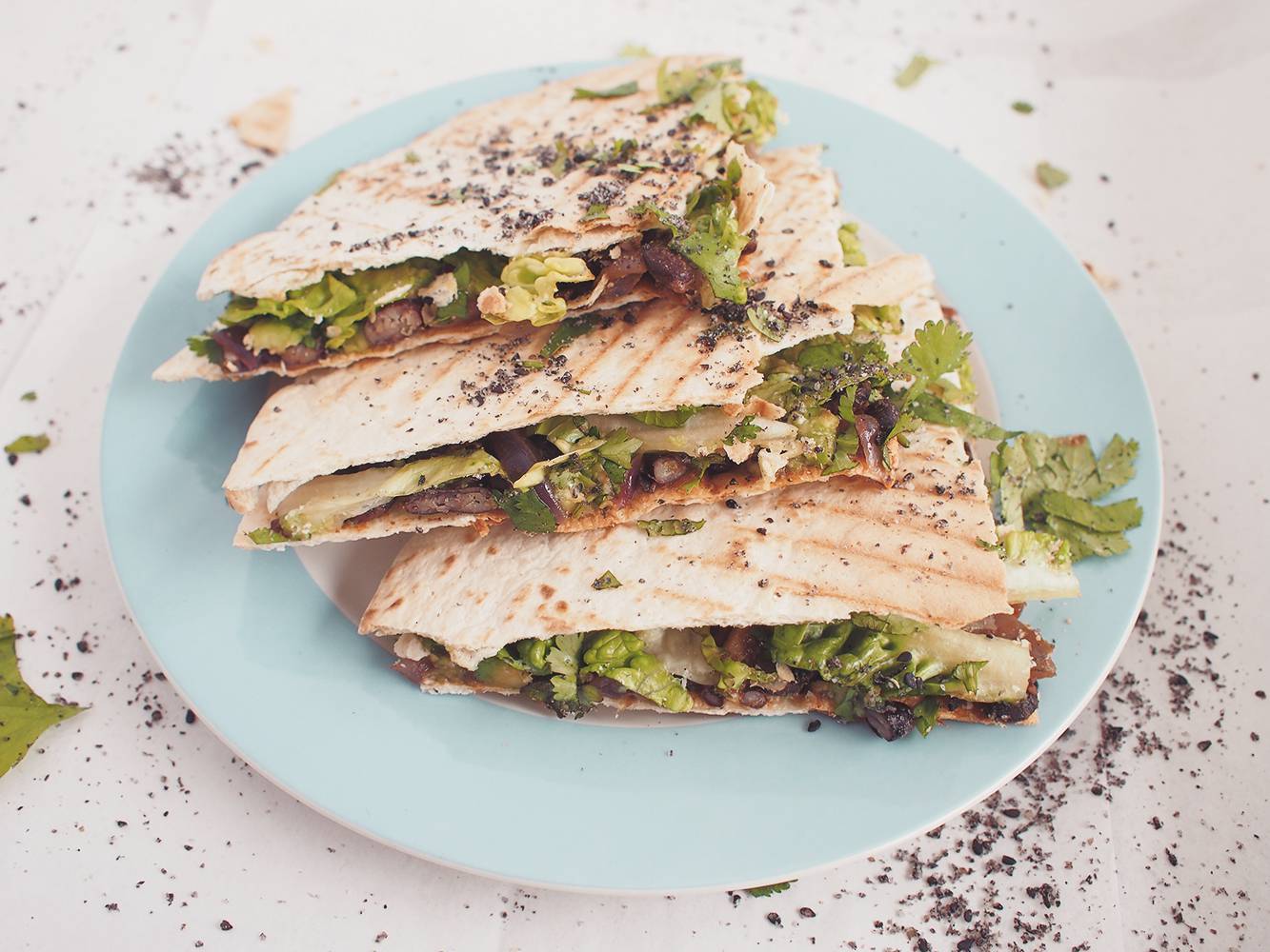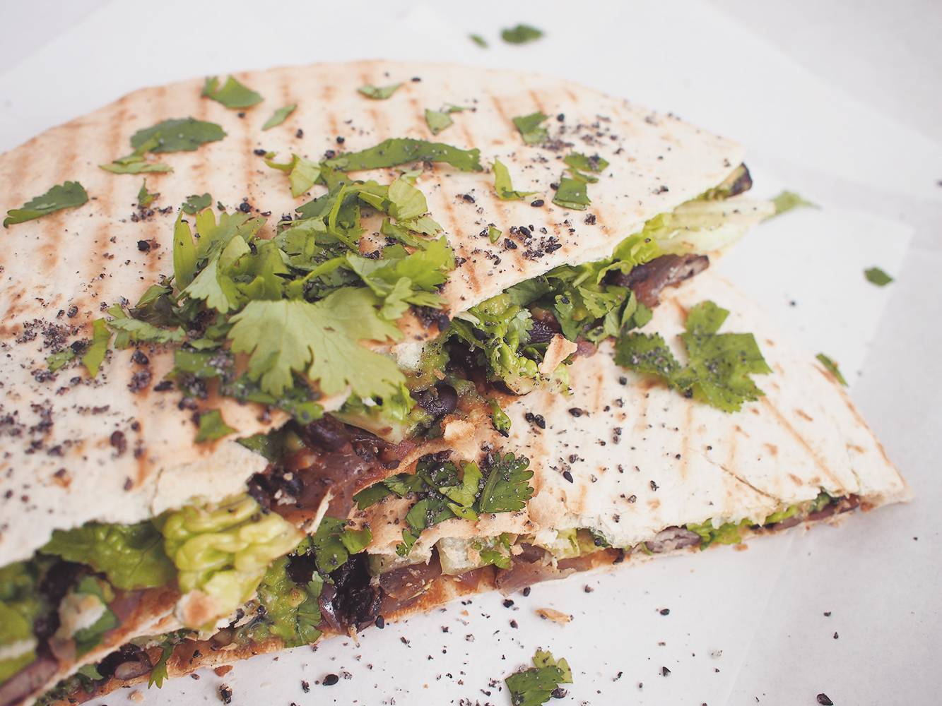 Quesadilla powinna być z serem, ale nie będzie. Nadziałam ją dobrze przyprawioną czarną fasolą z karmelizowaną czerwoną cebulą, kwaśnym guacamole i świeżą sałatą oraz kolendrą. Podane na ciepło grillowane tortille pszenne, posypałam czarnym gomashio. Jeśli naprawdę masz taką potrzebę, możesz dodać do środka starty roślinny ser, będziesz bliżej Meksyku :P