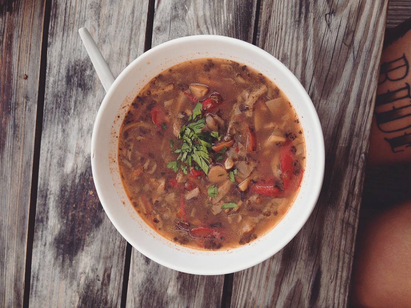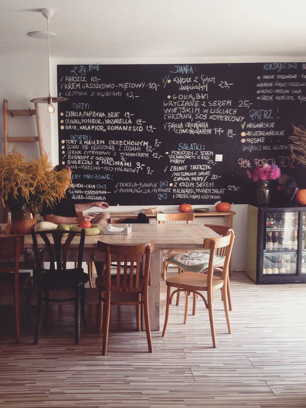 Menu rozpisane na tablicy zmienia się co jakiś czas, ma dość przejrzystą nawigację kolorystyczną co jest wegańskie, a co wegetariańskie. Znajdziesz w nim zupy, tarty, sałatki, dania obiadowe, desery i koktajle. Lokal serwuje także śniadania, kraftowe piwa, kawy (plusem jest dostępność mleka sojowego i kokosowego ;) i herbaty.