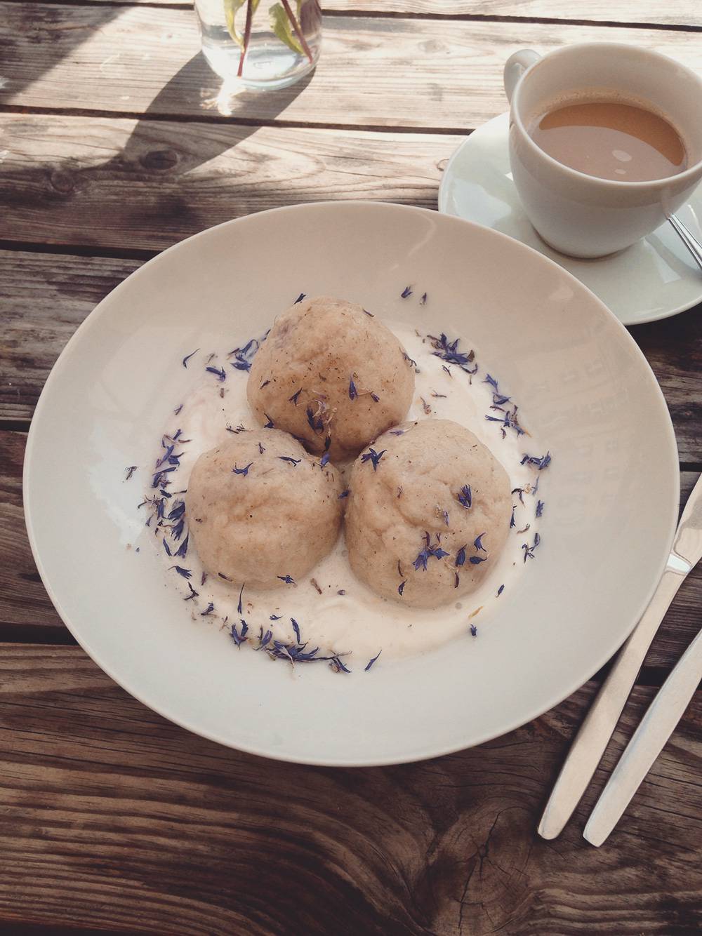 Danie które pozostawiło po sobie pozytywne wspomnienie to knedle z waniliowym sosem. Może i lepkie, może i słodkie, ale dość ciekawe w smaku. Niemalże klasyczne knedle ze śliwką, w delikatnym waniliowym sosie na bazie mleka kokosowego, posypane płatkami chabrów. Planuję zrobić „cover” tego dania ;)